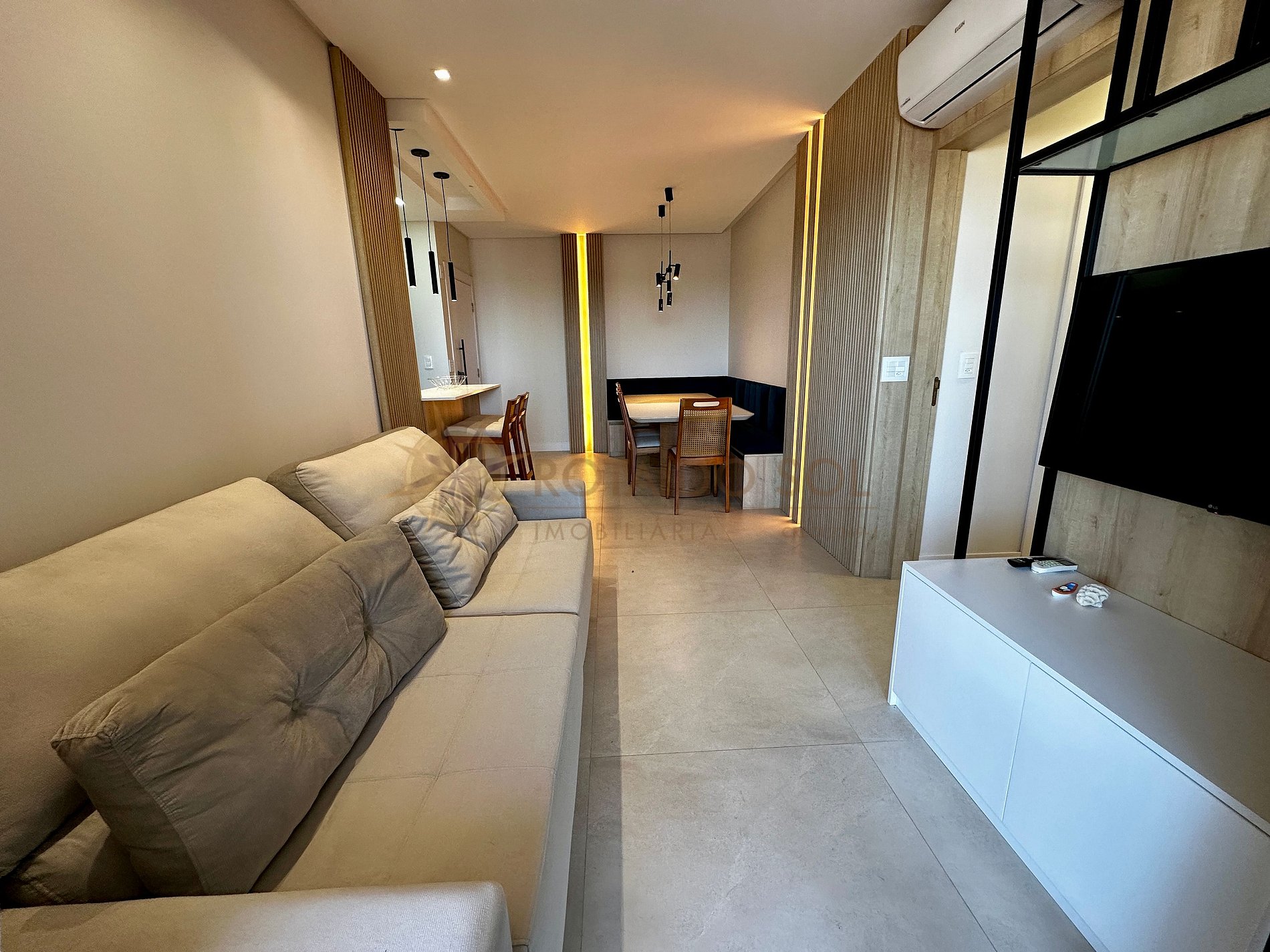 O imóvel oferece 3 quartos, (sendo 1 suíte), todos equipados com camas de casal e ar-condicionado. A sala de estar e jantar integradas proporcionam um ambiente acolhedor e moderno, ideal para momentos em família.