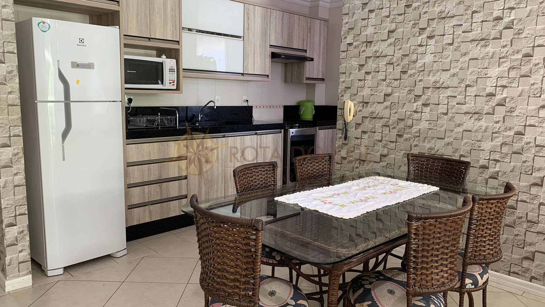 Cozinha completa com fogão, geladeira, micro-ondas e utensílios básicos