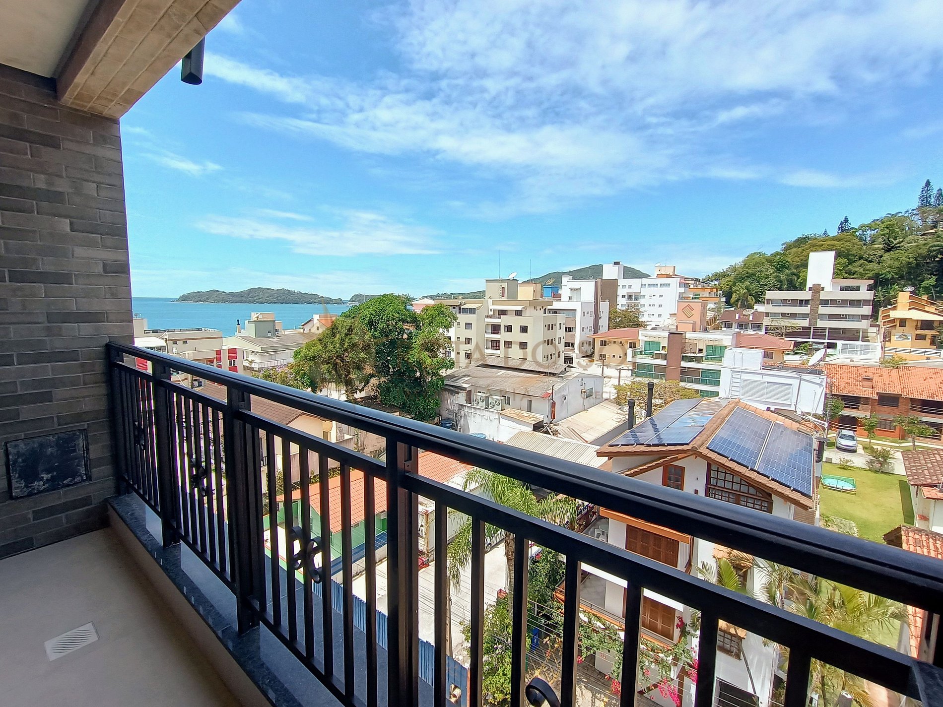 sacada com churrasqueira e vista mar parcial;