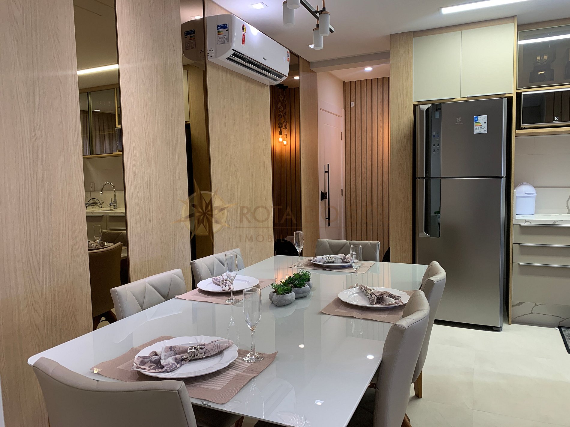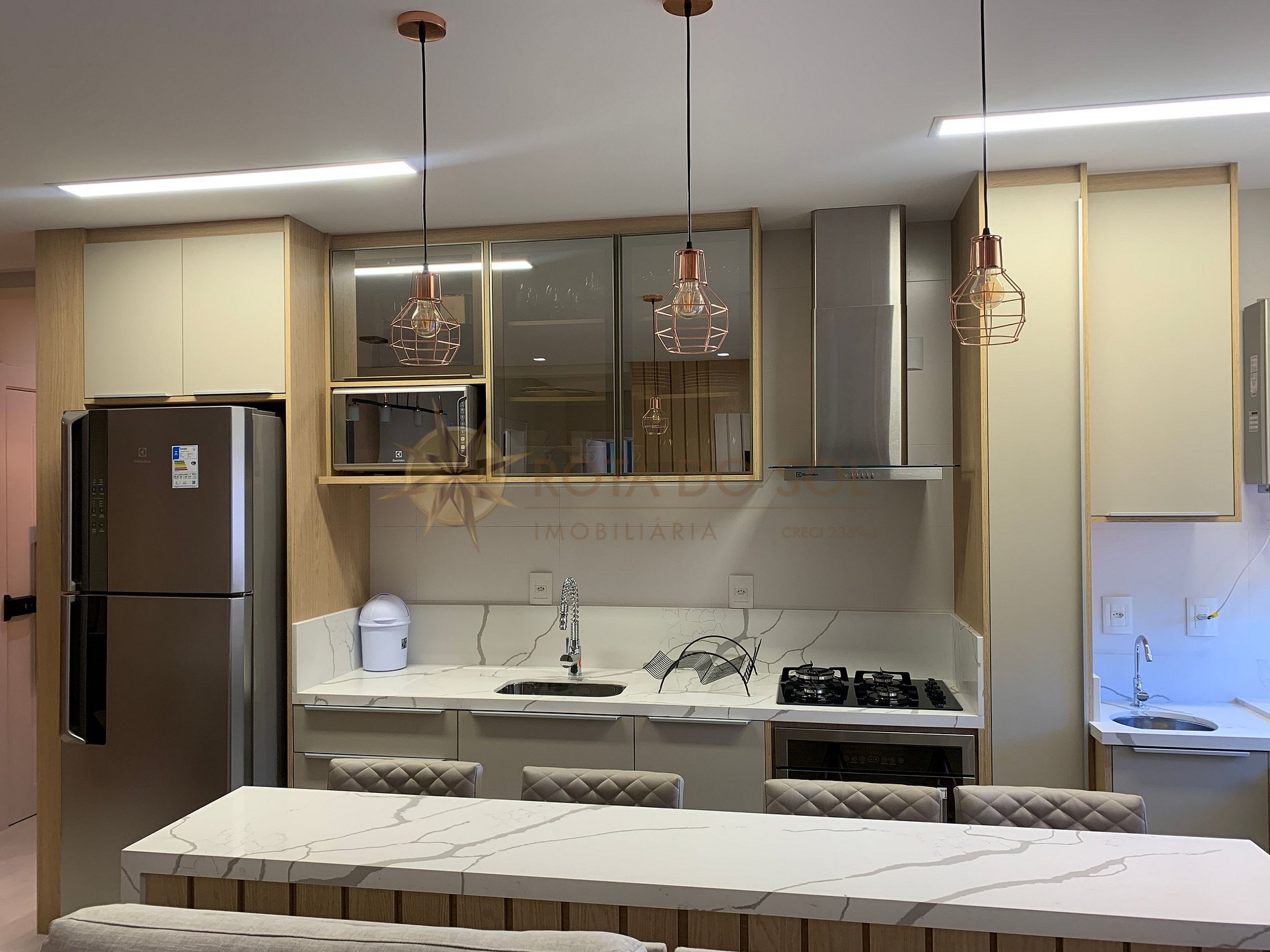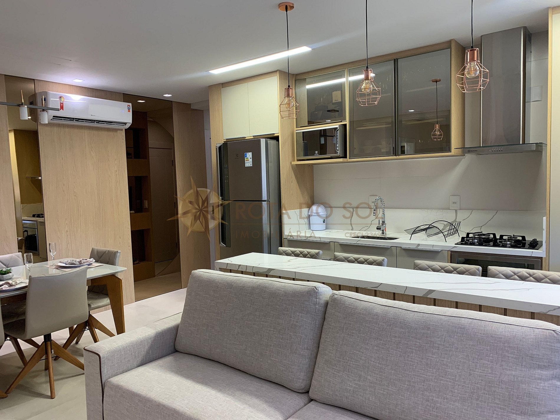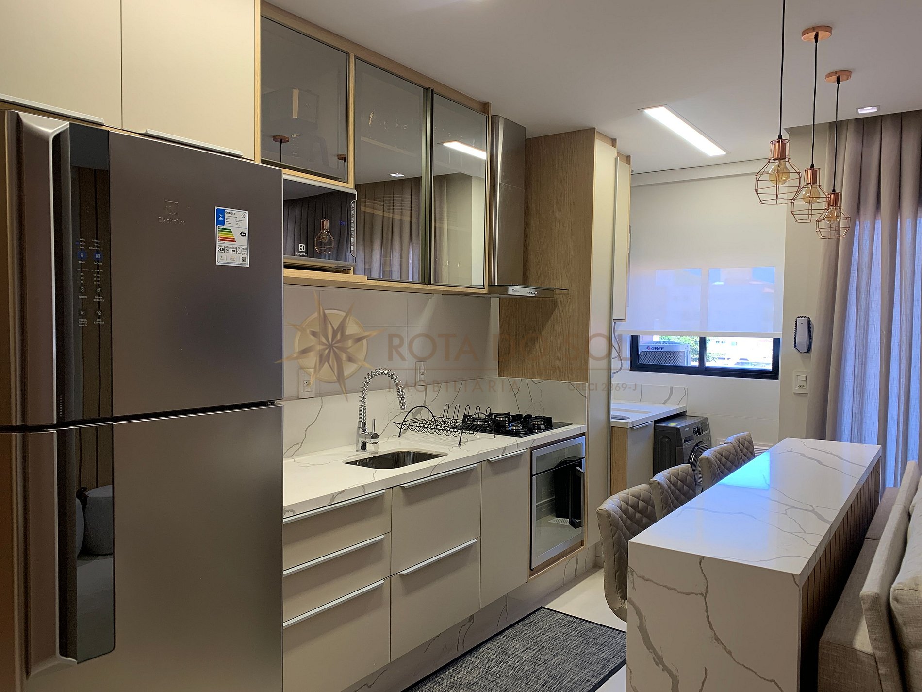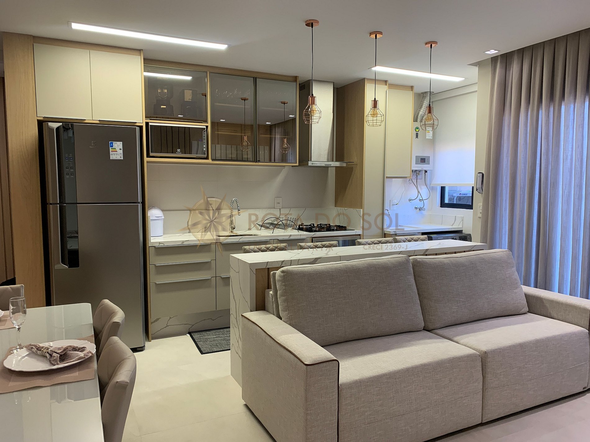 Sala de jantar e cozinha integradas;