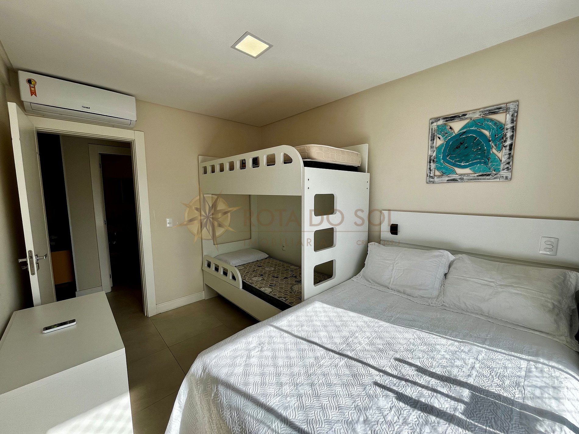 - 01 quarto com cama box de casal + 1 beliche e ar condicionado split.