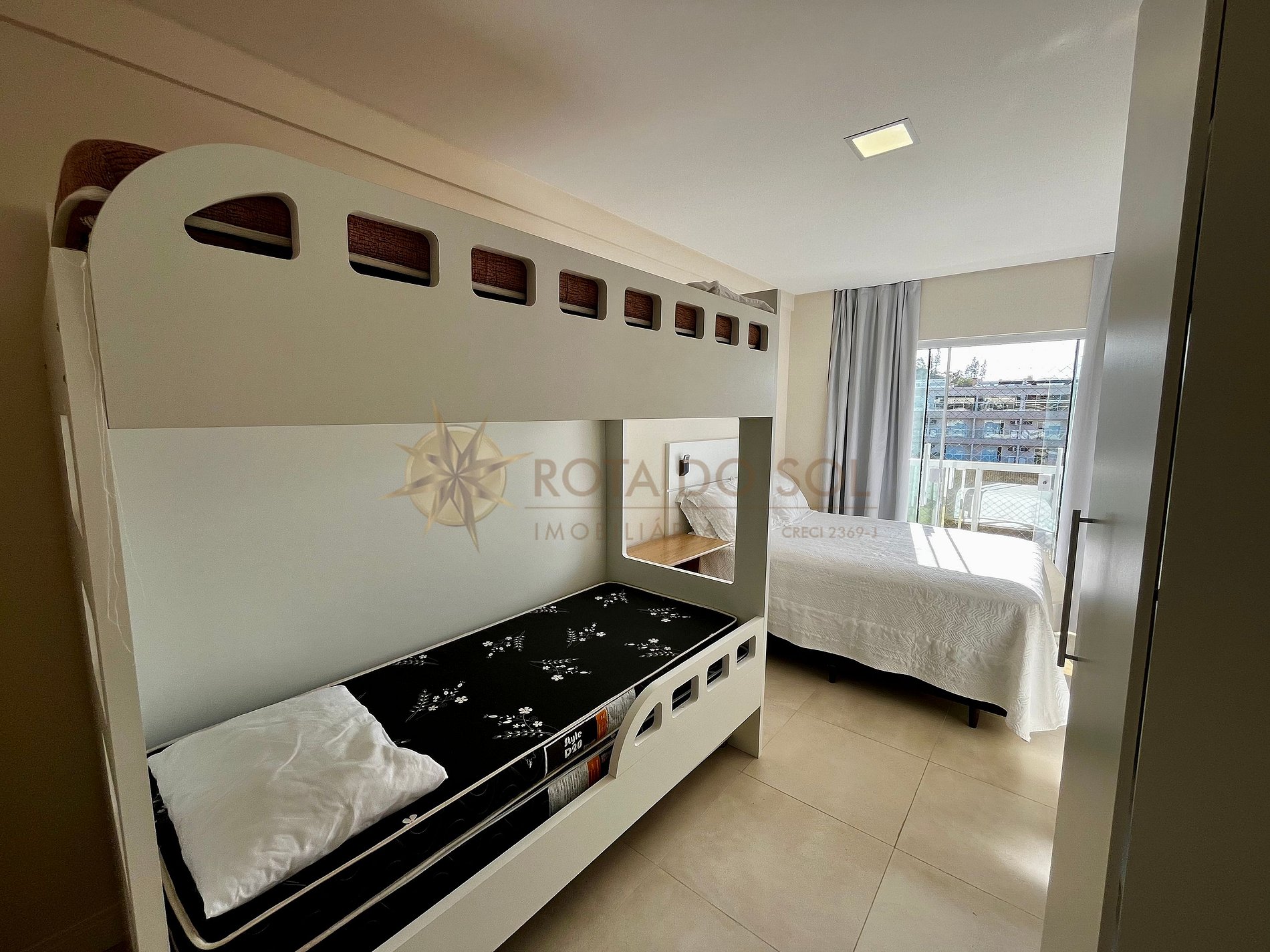 - 01 suíte com cama box de casal + 1 beliche e ar condicionado split.