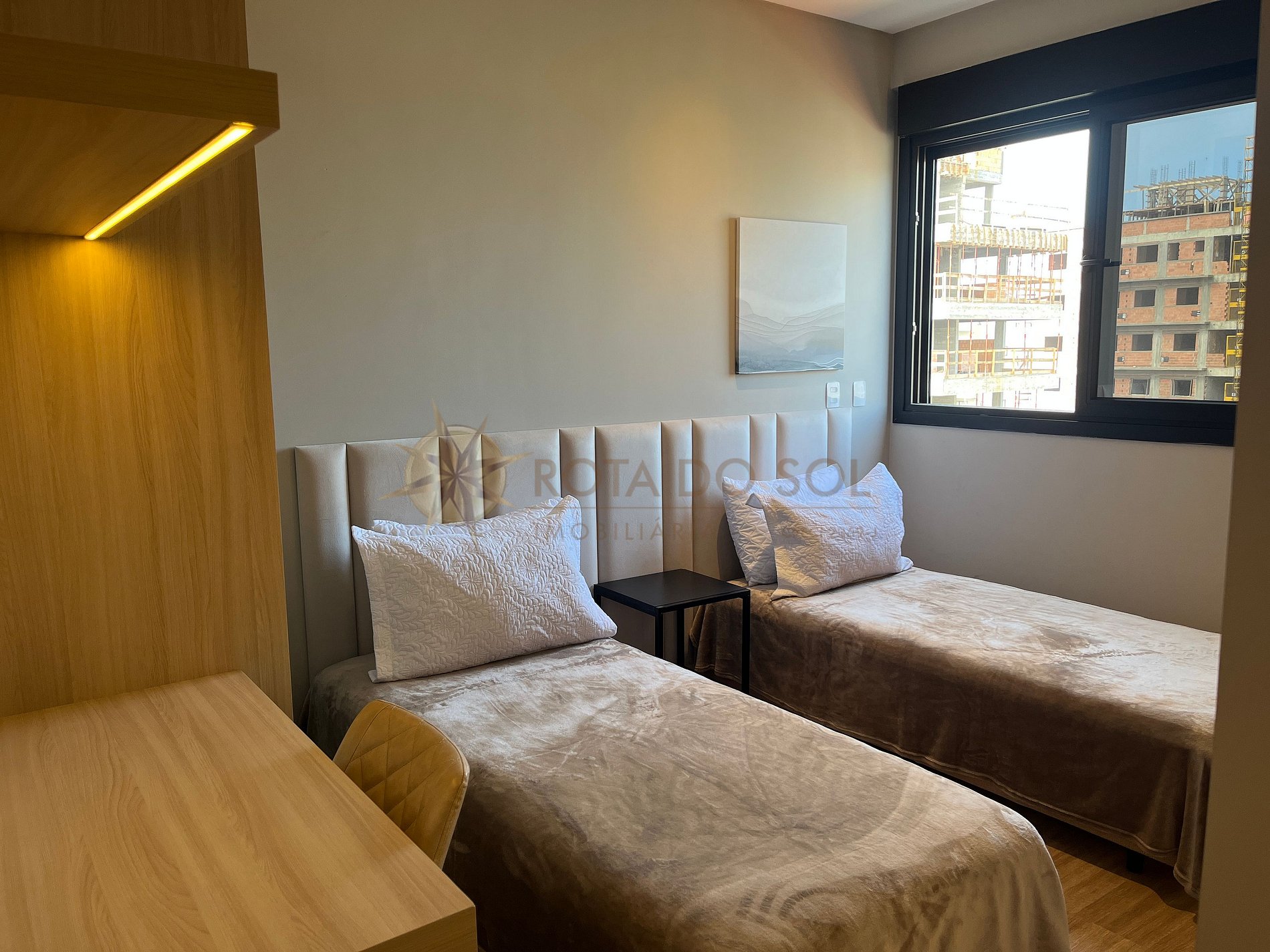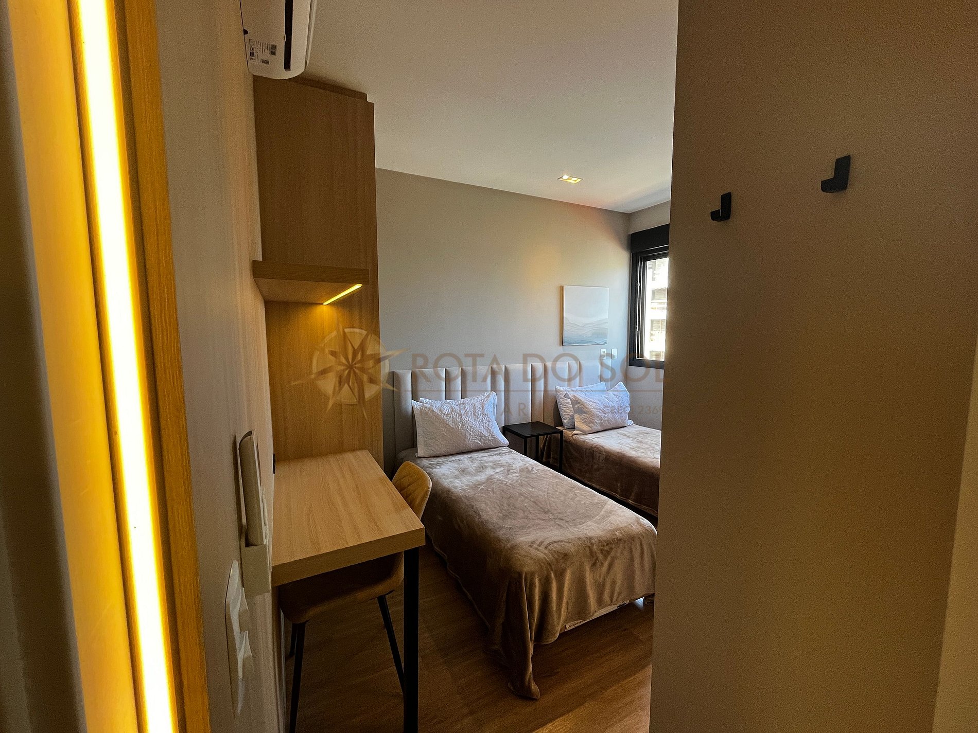 - 2 suítes aconchegantes – uma com cama super king, closet e espaço para home office; a outra com 2 camas de solteiro (reversíveis em casal), também com espaço de trabalho e ar-condicionado;