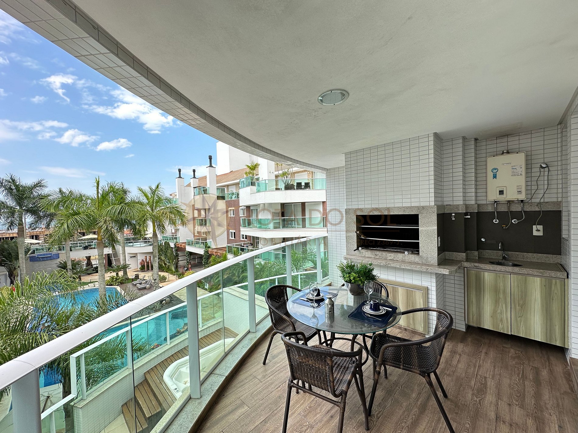 Sacada com churrasqueira e vista para piscina;
