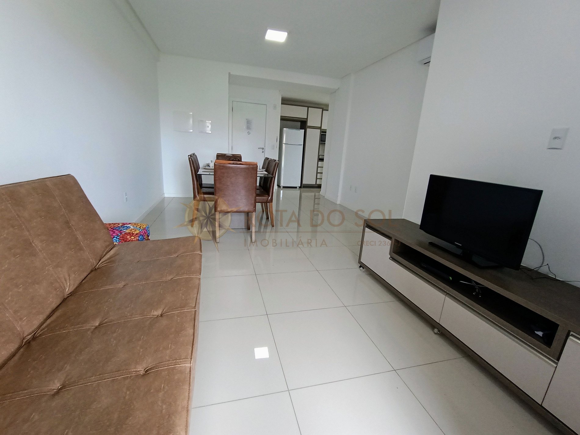 Sala de estar com TV, sofá cama e ar condicionado;