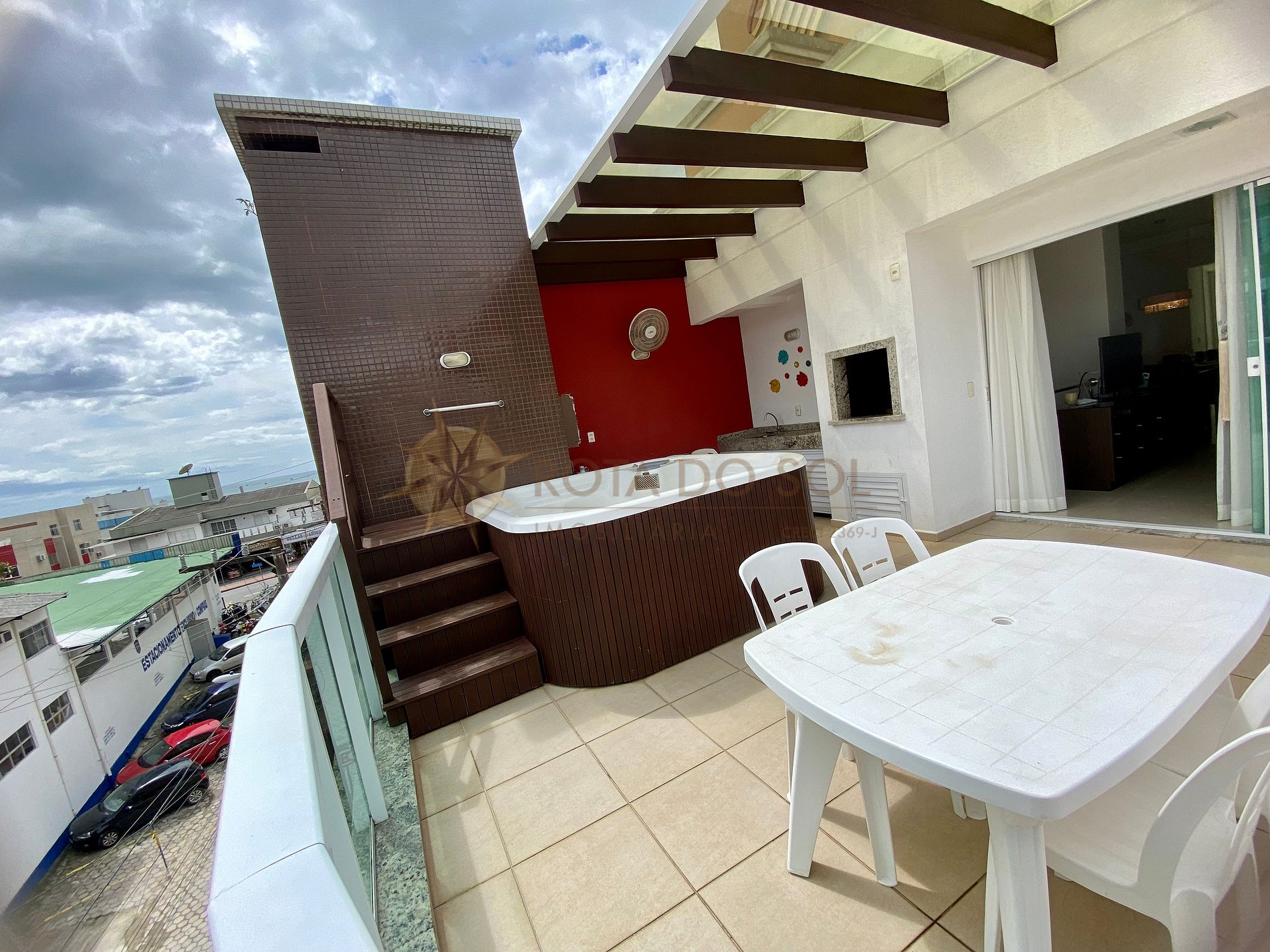 Amplo terraço com churrasqueira e banheira jacuzzi sem aquecimento.