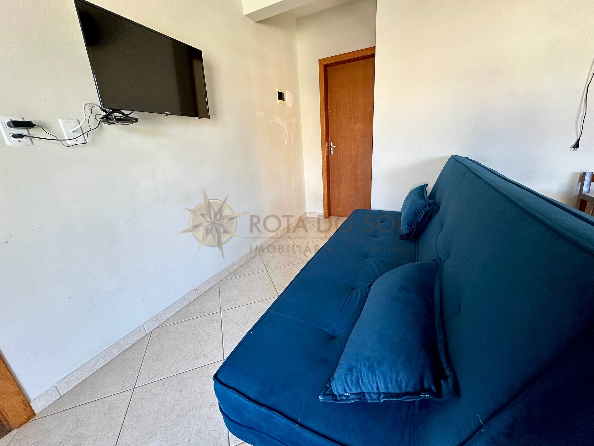 Sala de estar com TV Smart 32" e sofá-cama;
