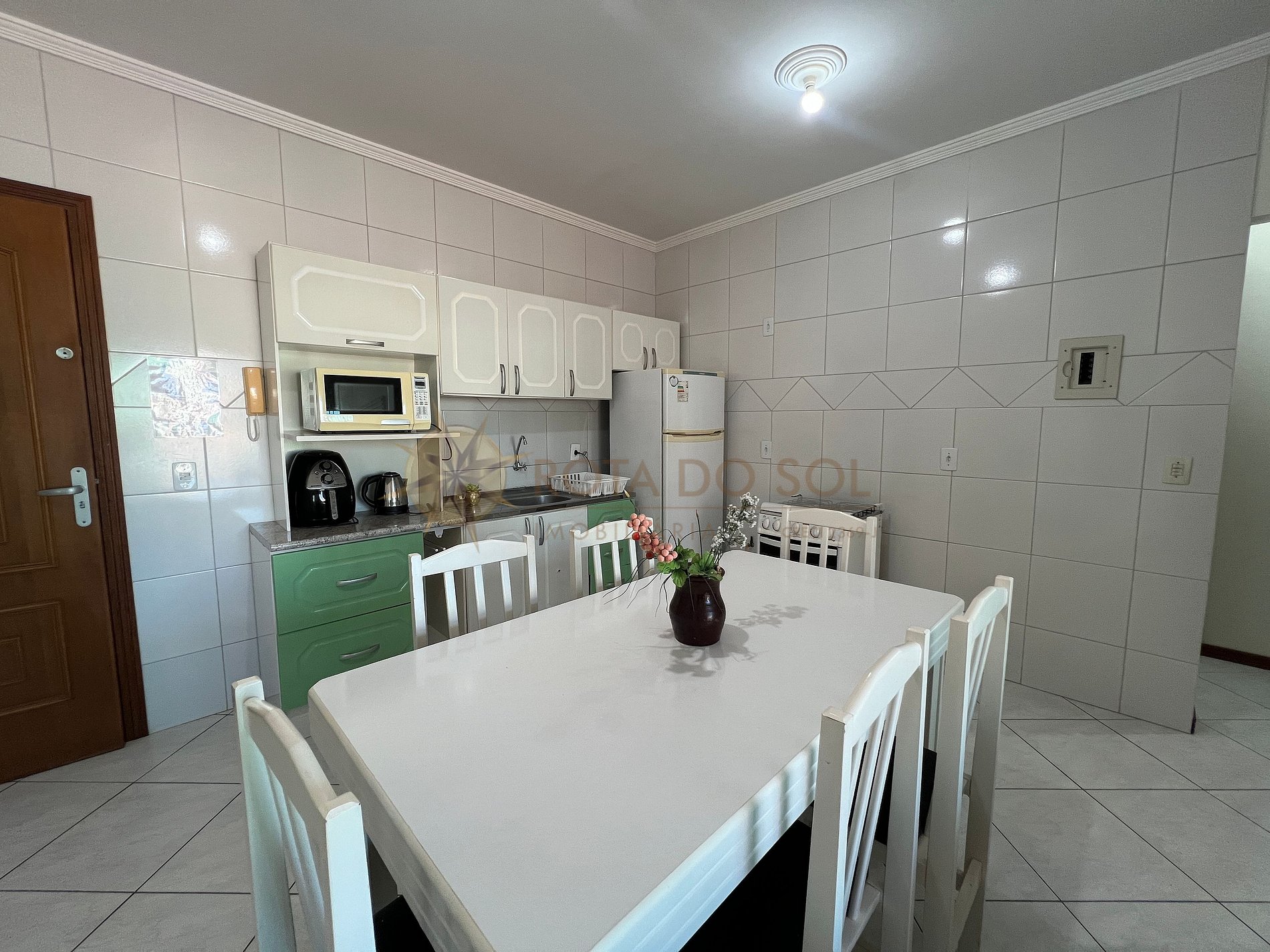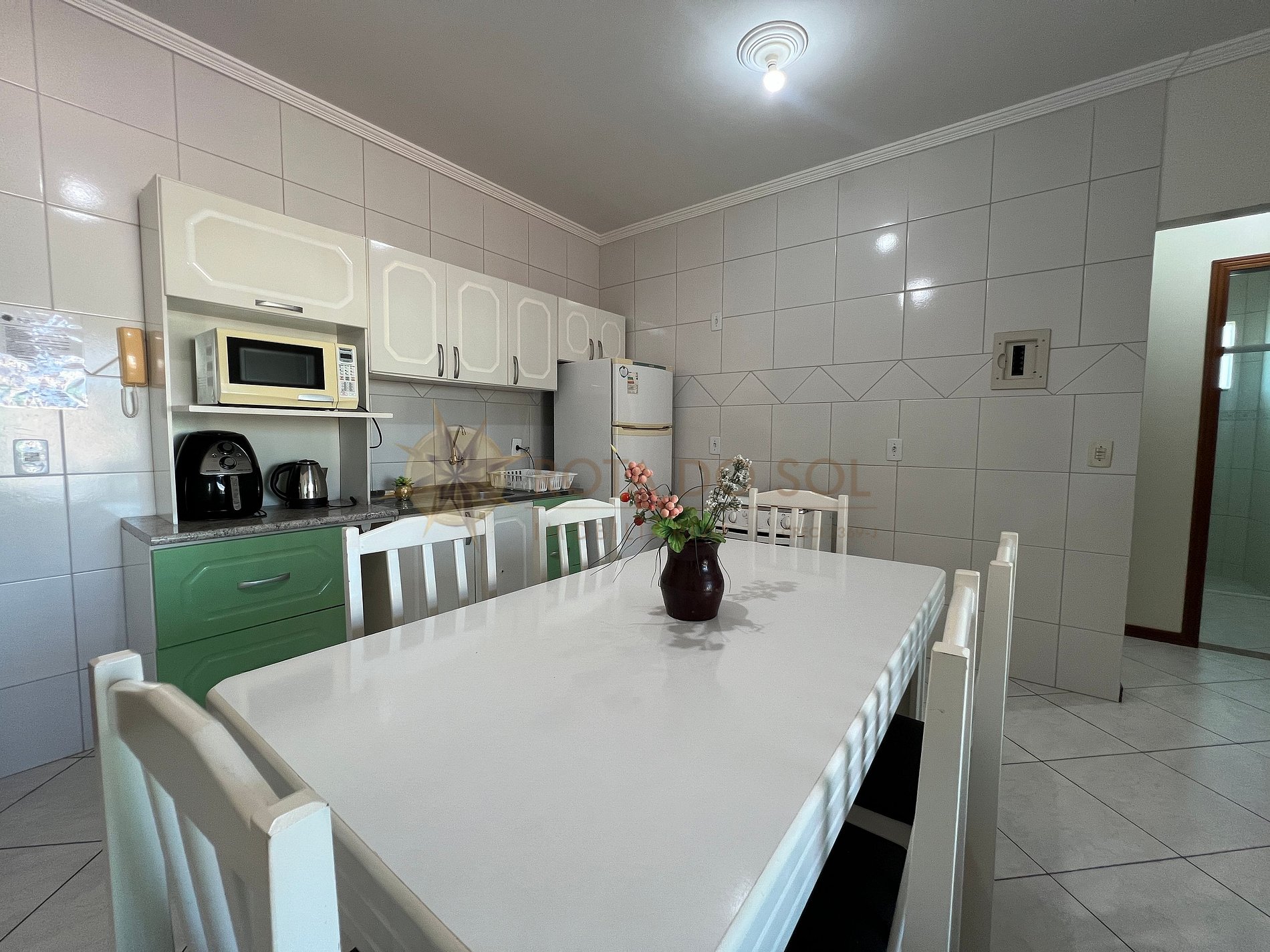 Cozinha com micro-ondas, fogão, geladeira e demais utensílios básicos;