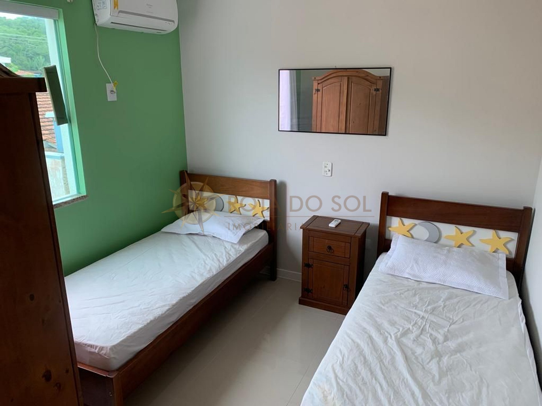 01 Dormitório com 2 camas de solteiro com ar-condicionado, 2 colchões sobressalente;